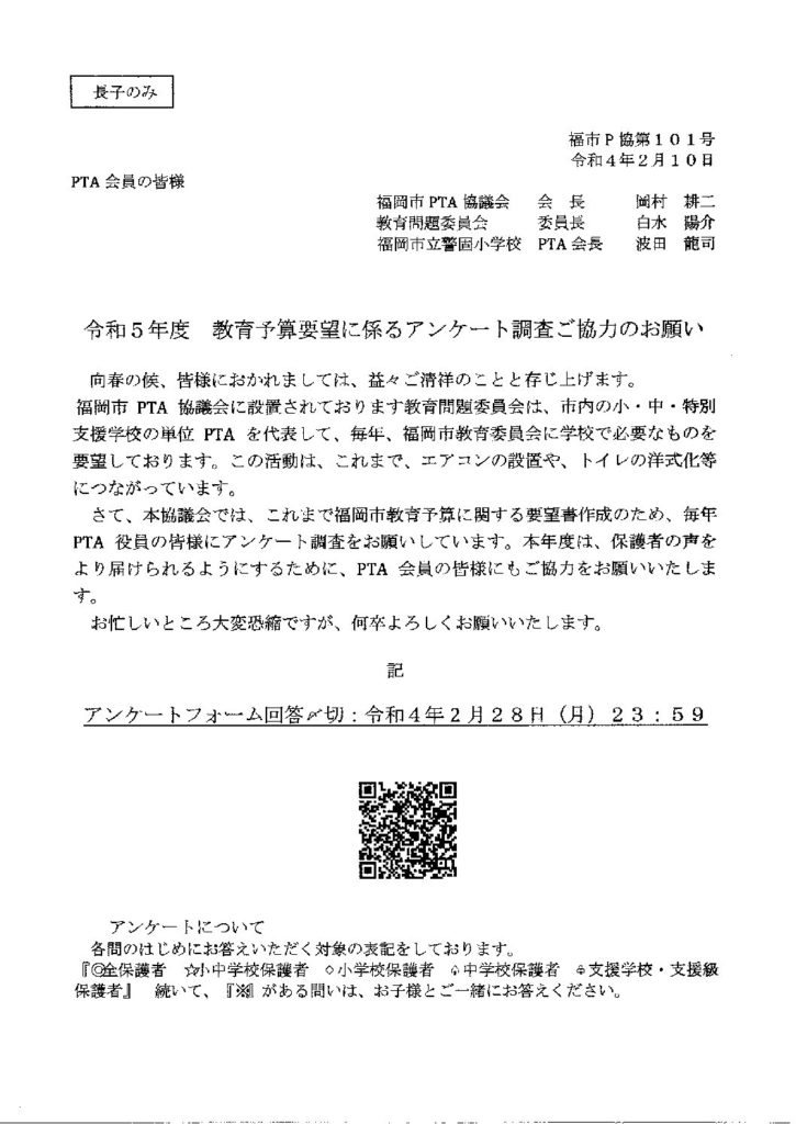 福岡市PTA協議会より、福岡市教育予算に関する要望書作成のためのアンケート調査ご協力のお願いです。