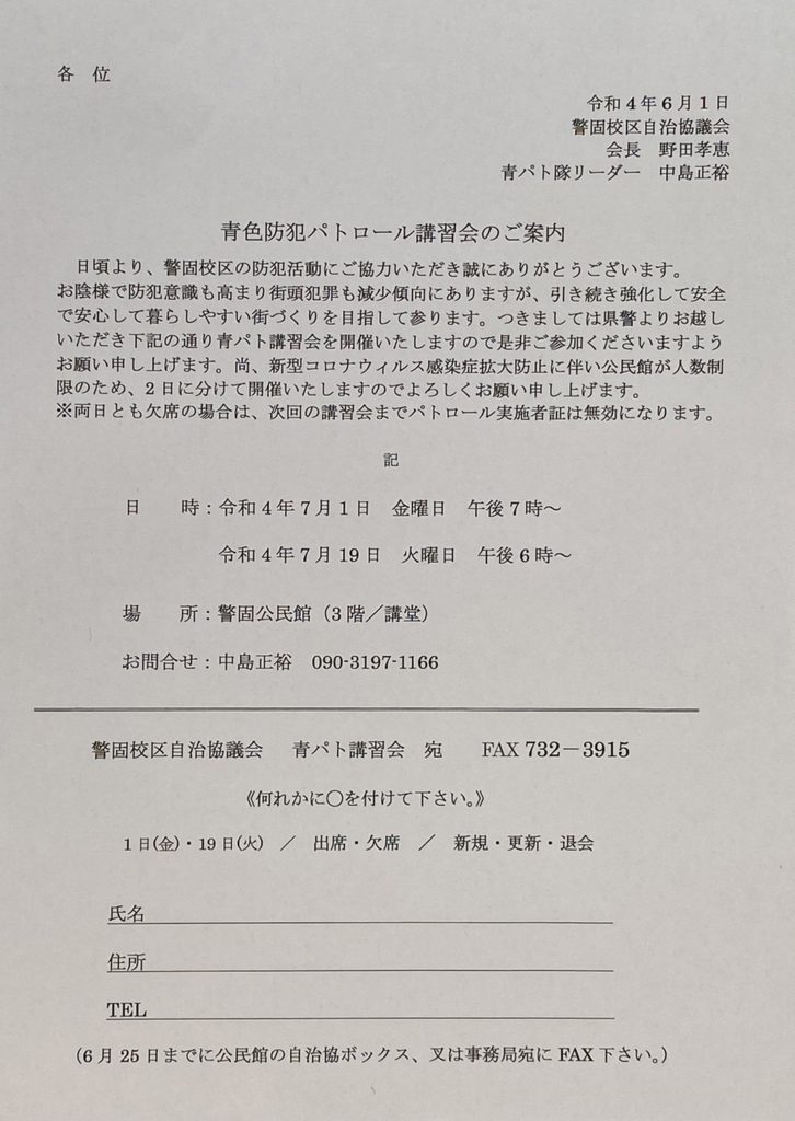 そのパトロール車に乗るための実施者証の講習会です。先着7名となっておりますので、ご興味あられる方は、ぜひ講習会へのご参加をお願いします(7月1日分は実施済みです)。