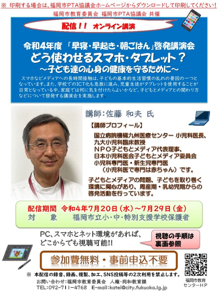 講師:佐藤 和夫氏 国立病院機構九州医療センター小児科医長、九大小児科臨床教授 NPO子どもとメディア代表理事 日本小児科医会子どもとメディア委員会 小児科専門医・新生児専門医