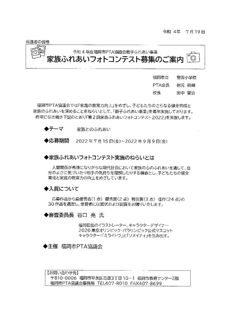 日頃より、PTA活動へのご理解、ご協力ありがとうございます。今回は、警固校区自治協議会からのご案内です。