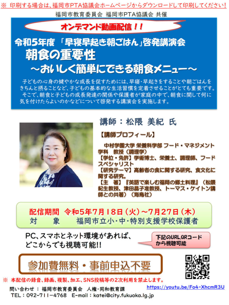 令和5年度「早寝早起き朝ごはん」啓発講演会オンライン配信のご案内 朝食の重要性~おいしく簡単にできる朝食メニュー~