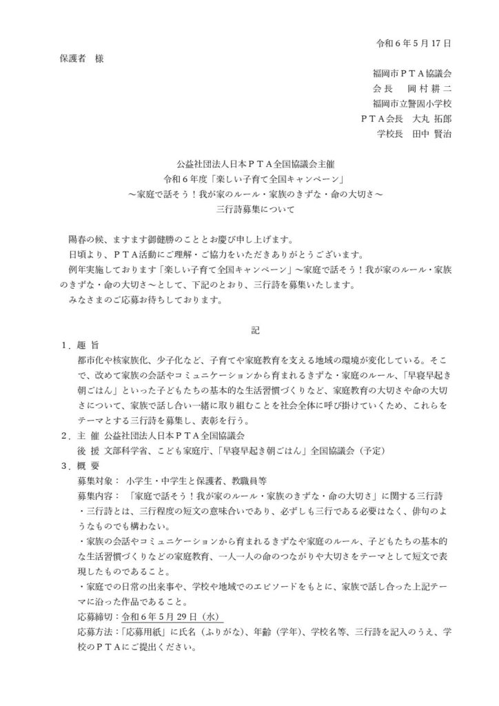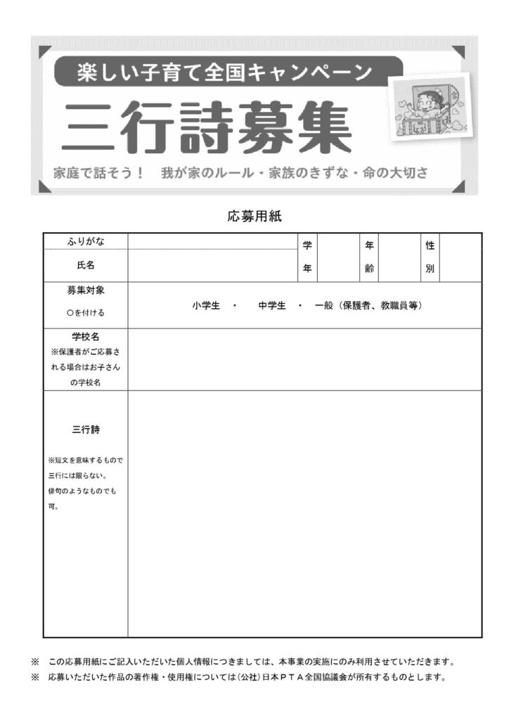 例年実施しております「楽しい子育て全国キャンペーン」~家庭で話そう!我が家のルール・家族のきずな・命の大切さ~として、三行詩を募集いたします。