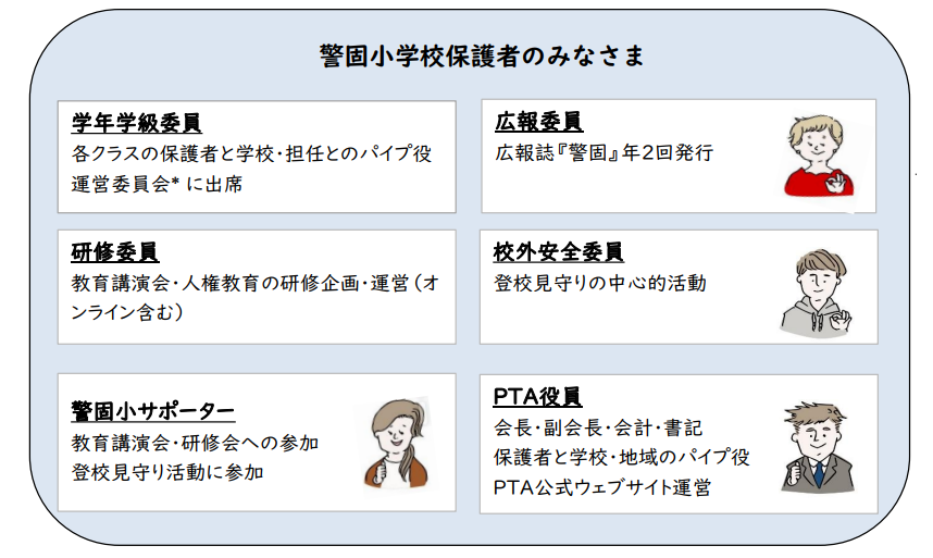 警固小学校父母教師会(PTA)は、父母または保護者と教師が積極的に協力して、学校と家庭及び地域社会における児童の幸福な成長を図ることを目的としています。