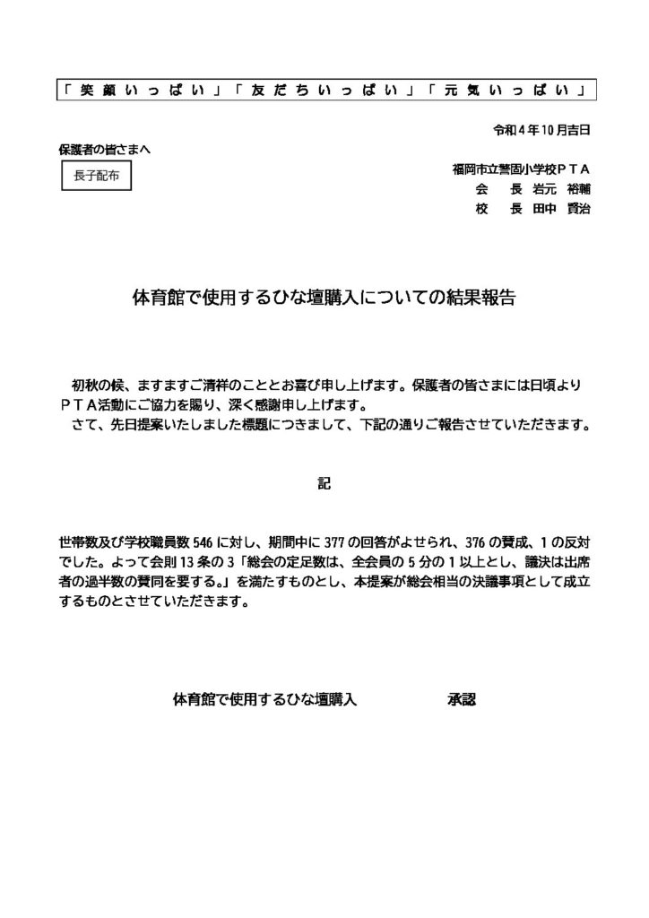 世帯数及び学校職員数538に対し、期間中に443の回答がよせられ、425の賛成、1の反対、17の無効でした。よって会則第10条により会員の過半数の賛同をもって、令和4年度のPTA役員・会計監査員が承認されました。